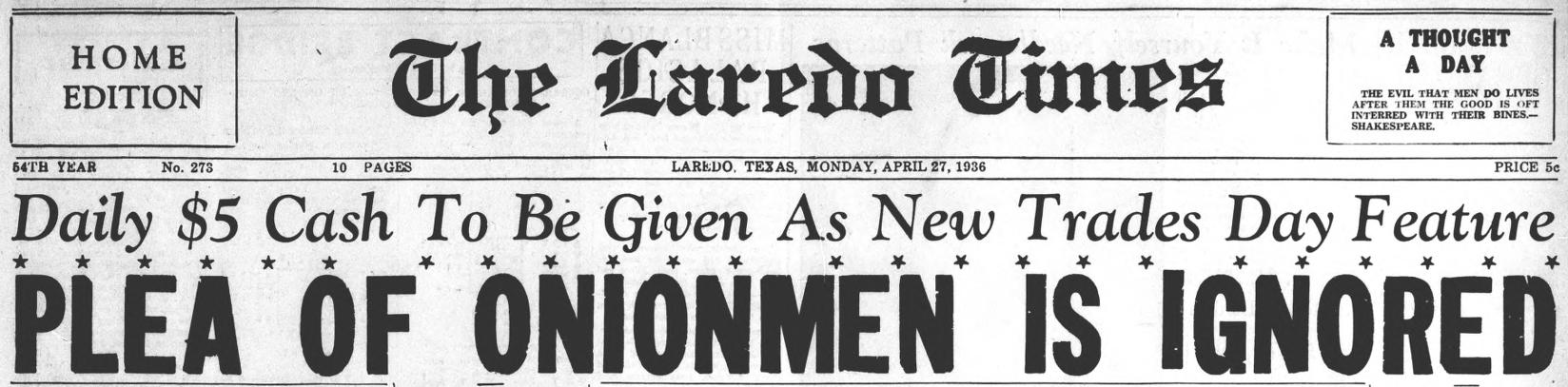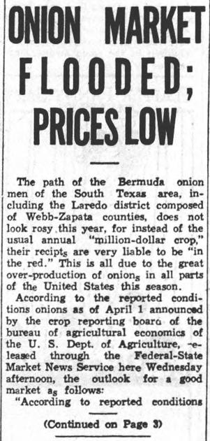 Though production had reached all-time highs by the mid-1930’s, profitability slipped to just above a 20-year low and both local and national markets were thoroughly saturated. The collapse culminated in a headline from the April 30, 1936, issue of The Laredo Times that read, “Government buying onions.” The industry had overextended itself and needed a bailout. As was reported in December 1936 by news outlets from as far away as The McKinney Examiner (McKinney, Texas), the “Onion outlook not so good in South Texas.”